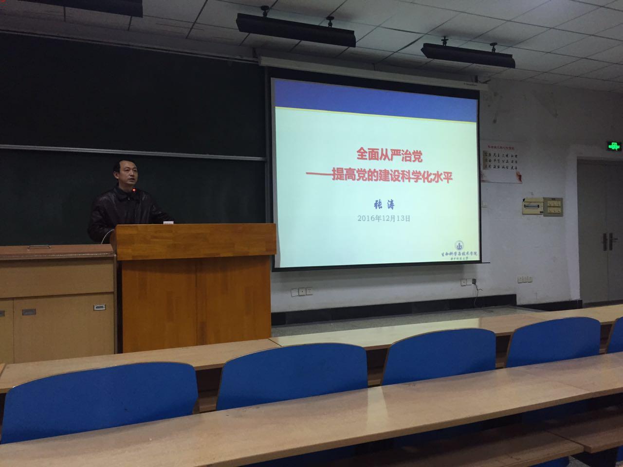本次党课以“全面从严治党,提高党的建设科学化水平”为主要内容,比较系统地阐述了党的十八大特别是党的十八届六中全会以来全面从严治党这一重大战略部署的战略地位、提出背景、丰富内涵、重要目标以及推进方式等五个方面。张涛同志指出,党要管党,必先治好党,治党又务必从严;而治好党的关键在于加强思想和制度建设,把权力关进制度的笼子。他在党课上号召全体党员守住党纪党规这一“底线”,教师党员应该做到“四有”,学生党员应该做到“六有”,扎实有效地开展“两学一做”教育活动,夯实“学”的基础,锻炼“做”的本领。张涛同志用浅显易懂的语言,结合学院师生的生活实际,勉励广大基层党员认真学习贯彻习近平同志系列重要讲话和党的十八届六中全会精神,争做合格党员,更好地发挥基层党组织的战斗堡垒作用。