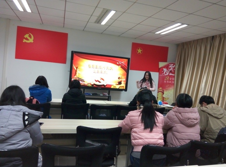 余欢同学以“学思践悟十九大之新时代”为主题,介绍大会概况,大会主题,并对十九大报告进行解读,以提问的方式加深党员们对十九大背景及内容的理解。
