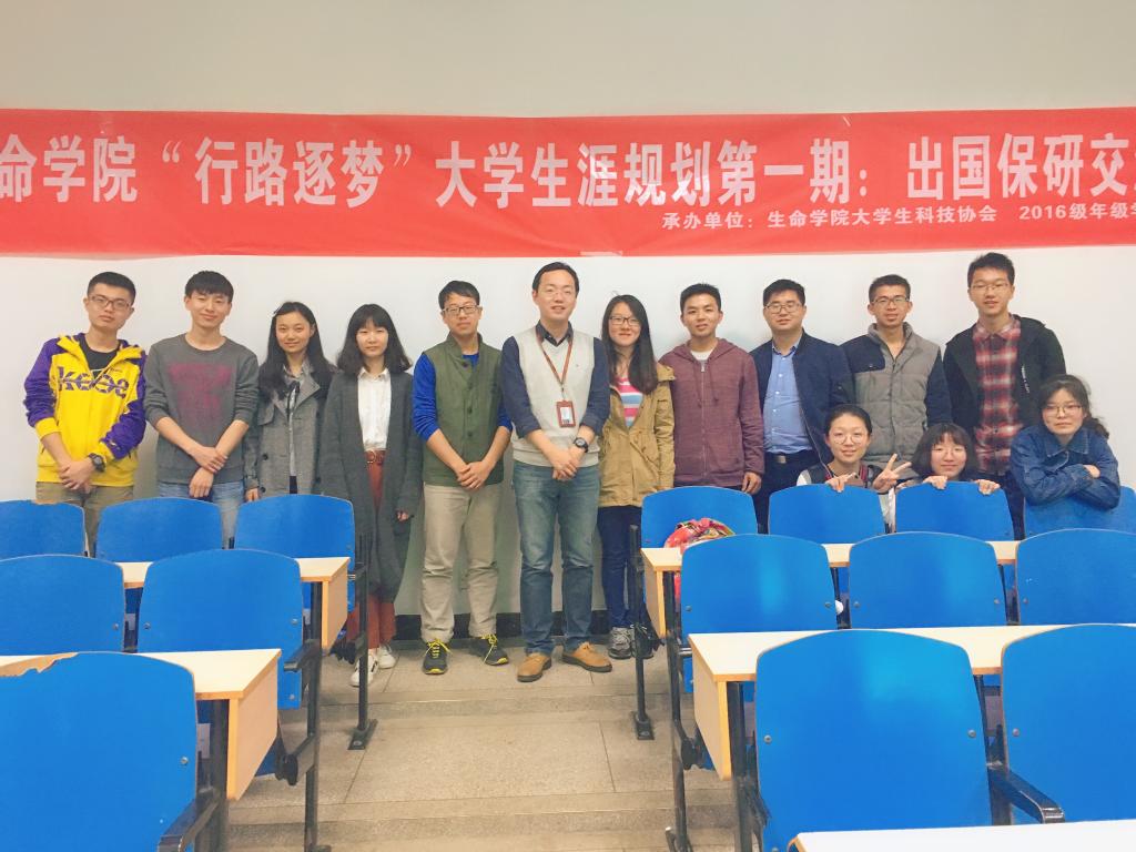 3月30日,由生命学院大学生科协和16级党支部联合举办的“行路逐梦”大学生涯规划第一期顺利举行,刘剑淼教授和14级学生万能、秦季玥、毛峻雄、王红英、李东作为分享嘉宾出席本次活动,学工组组长占艺为同学们解读出国、保研政策,辅导员段政出席本次活动。