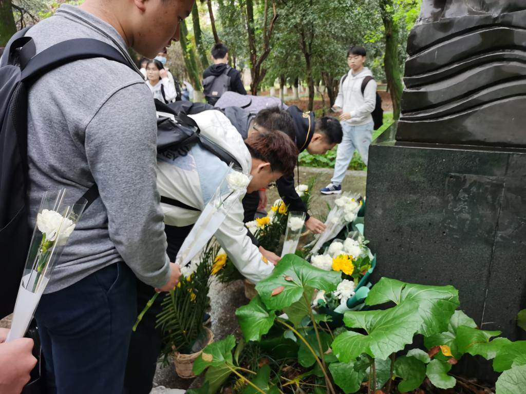 会后大家难抑心中崇敬之情,一同来到了青年园的胡吉伟塑像前。雨后的青年园更填一份肃穆,胡吉伟塑像前已有同学摆放了千纸鹤、菊花,同学们每人手持一朵白色康乃馨,代表着尊敬、纯洁、真情,更代表了同学们的哀悼与追思。大家依次上前摆在塑像前,以缅怀英雄校友,体悟胡吉伟精神。