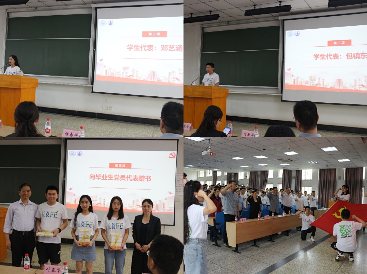 教工党支部书记代表付春华老师和朱俊铭老师向优秀毕业生党员代表赠书,鼓励大家从党史中汲取力量,在新征程上奋勇向前。此后,党员代表带领全体党员重温入党誓词,面对党旗,重新感悟入党初心,做出庄严承诺。