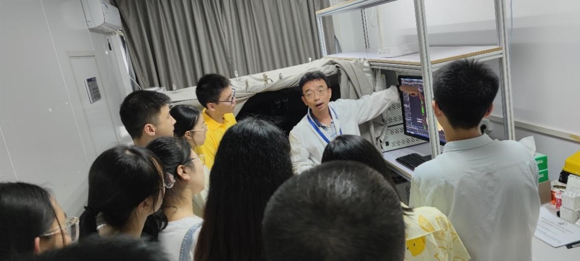 在雷敏老师的带领下,支部成员一同走进学院科研共享平台。雷老师依次介绍平台原子力显微镜、共聚焦显微镜、分析型超速离心机、台式离心机、高分辨串联质谱仪、串联飞行时间质谱仪等各类大型实验仪器设备。刘斌老师为大家重点讲解了超高速多光子显微镜成像系统的使用方法、检测原理以及技术优势。他还以观察小鼠大脑以及斑马鱼尾部结构为例,为大家生动展示了如何在不伤害组织的情况下观察到活体荧光成像结果。