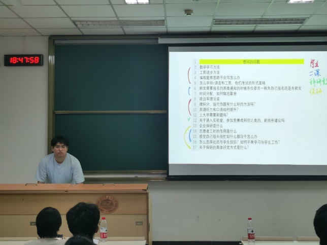 学期伊始、万象更新,23级生卓新同学刚刚迈入大学校园,期待与困惑共存。沈瑞同志针对前期收集的23级生卓同学的问题进行解答。沈瑞结合自己大一的学习经验,在解答问题的同时,还分享了自己对于学习和学习方法的观点,他认为,大学的学习主要是通识教育而非应试教育,应该把学习的重心重点放在知识而非考试上,对待知识应该理解并吸收,而非单纯训练做题。沈瑞鼓励大家积极勇敢的从高中的学习思维和学习习惯中跳出来,早日适应大学生活。