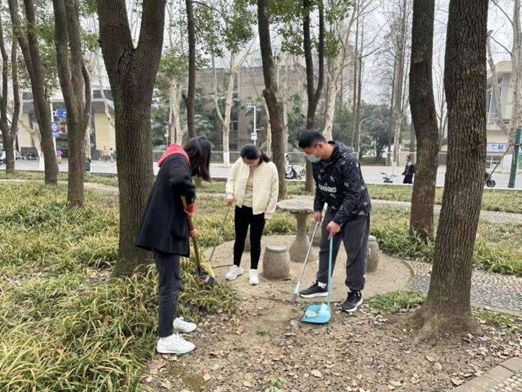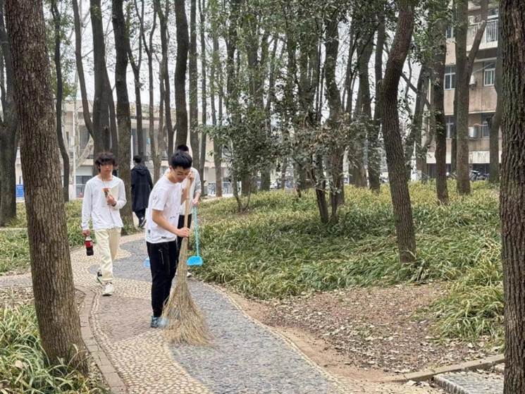 支部学生志愿者们分成多个小组前往学院附近树林开展志愿服务。志愿者拿着扫帚、簸箕等清扫工具,清理残枝清扫落叶,捡拾塑料袋、烟头、纸团等垃圾等。大家团结协作,细致有序,不落下任何一个角落,让学院周边环境得到了改善。