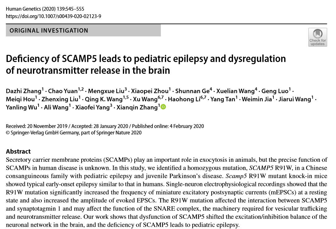 (Correspondent Zhang Dazhi, Chen Jun) In April 2020, Professor Zhang Xianqin's team from College of Life Science & Technology, Huazhong University of Science and Technology, published an article on Human Genetics, one top journal in the field of Genetics. The research paper entitled: “Deficiency of SCAMP5 leads to pediatric epilepsy and dysregulation of neurotransmitter release in the brain”.