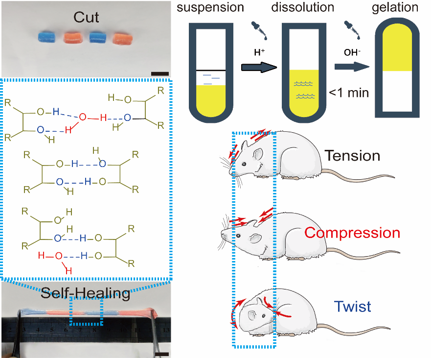 Figure 1. Schematic diagram of rapidly fabricated self-healing gel applied for the wound repair in the stretchable site