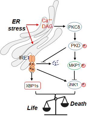 Endoplasmic reticulum (ER) plays a key role in various cellular processes, including protein synthesis, folding, lipid synthesis, cellular calcium and redox homeostasis. Its homeostasis is essential for maintaining normal cell function. When the endoplasmic reticulum of a cell is unable to bear the load of misfolded proteins, it triggers ER stress and activates the UPR (Unfolded Protein Response) signaling pathway to enhance the protein processing capacity of ER. Under ER stress, it plays an important role in regulating the fate of cells, and the specific molecular mechanisms need to be further understood.