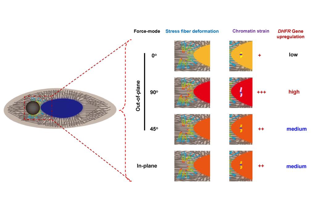 Dr. Wei et al. then find that the gene expression was positively associated with chromatin stretching. Inhibiting prestress of actin stress fibers decreases cell stiffness, chromatin stretching, and gene upregulation. Completely disrupting actin stress fibers abolishes cell stiffness anisotropy, chromatin deformation, and gene upregulation. Theoretical modeling reveals that actin stress fiber is the key factor for the cell to respond to different modes of force.