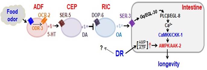 In this study, C.elegans, one classic model system in aging research, was used to comprehensively investigate the regulatory roles of food odors and olfactory perception of food in DR induced longevity. Surprisingly, the researchers found that odors released from food source could decrease the DR induced lifespan extension by 50%, while would not change the longevity of worms fed on ad libitum (AL) condition. Further, they identified one novel ‘brain-gut’ axis that transmits the signals from food odors to suppression of classic nutrient sensor AMPK activity in C.elegans intestine, thus leading to the inhibition of DR induced longevity: under DR, food odors would activate serotonergic ADF neurons, and then stimulate the activity of dopaminergic CEP neurons via serotonergic GPCR SER-5, which would inhibit the octopamine release from RIC neurons via dopaminergic GPCR DOP-6; less octopamine received by the downstream putative octopaminergic GPCR SER-3 would cause lower activity of EGL-30/EGL-8/CKK-1 signaling cascade, which could reduce the phosphorylation level and activity of AAK-2/AMPK in C.elegans intestine, ultimately leading to the inhibition of DR mediated lifespan extension. Moreover, intestinal AMPK and the olfactory neuron circuit for perception of food are determined as the two critical ‘hubs’ to integrate the odor signals and nutrient values from food source for DR mediated longevity: intestinal AMPK is not only negatively regulated by food odors via a brain-gut signal but also could be allosterically activated by AMP, the level of which would greatly increase under DR; while, the activity of olfactory neuron circuits for perception of food not only stimulated by food odors but also modulated by the internal energy level (AMP/ATP ratio). More importantly, the further experiments performed with primary adipocytes and hepatocytes clearly demonstrated that α-1A adrenoceptor, the homolog of SER-3 in mammalian cells, and the downstream Gq/PLCβ/CaMKK signaling cascade could regulate AMPK activity in a similar manner as in C.elegans intestine, which indicates that this pathway in highly conserved, and would providing novel potential targets for anti-aging research.