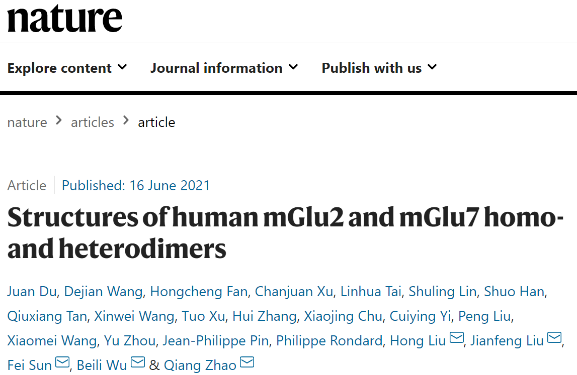 On June 16th, the teams of Prof. Jianfeng Liu from College of Life Science & Technology, Huazhong University of Science,key Laboratory of Molecular Biophysics, Ministry of Education , Beili Wu, Qiang Zhao, Hong Liu and Fei Sun of the Institute of Biophysics, Chinese Academy of Sciences published a research article entitled “Structures of human mGlu2 and mGlu7 homo- and heterodimers”in Nature. This study has made a breakthrough in identifying the high-resolution structure and signal regulation mechanism of mGlu2 homodimer, mGlu7 homodimer and mGlu2-mGlu7 heterodimer, which has important guiding significance for the development of specific targeting heterodimer drugs.