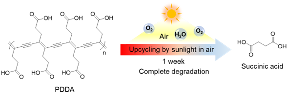 In this study, Luo and collaborators use poly(deca-4,6-diynedioic acid), or PDDA, a soluble polydiacetylene with short carboxyl side chains, as a model conjugate polymer to approach such an ideal degradation. When we put a piece of PDDA film into water, the soaked polymer film disintegrated into small pieces rapidly when standing on an outdoor shelf, and finally disappeared within one week. PDDA can be completely decomposed by sunlight in air, with a dominant green upcycling product of succinic acid, representing an ideal paradigm for the degradation and upcycling of conjugated polymers. Further study clearly demonstrated that PDDA undergoes a photo-oxidative degradation upon sunlight irradiation in air and 2-ketoglutaric acid should be a key intermediate, which is then decarboxylated and oxidized to the final product succinic acid.