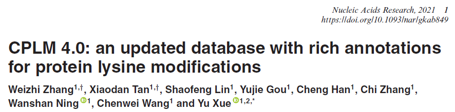 On Sept. 29th, 2021, the team of Prof. Yu Xue from College of Life Science & Technology, Huazhong University of Science published a research article entitled “CPLM 4.0: an updated database with rich annotations for protein lysine modifications” in Nucleic Acids Research. Weizhi Zhang and Xiaodan Tan are co-first authors of this article. Prof. Yu Xue is the corresponding authors.