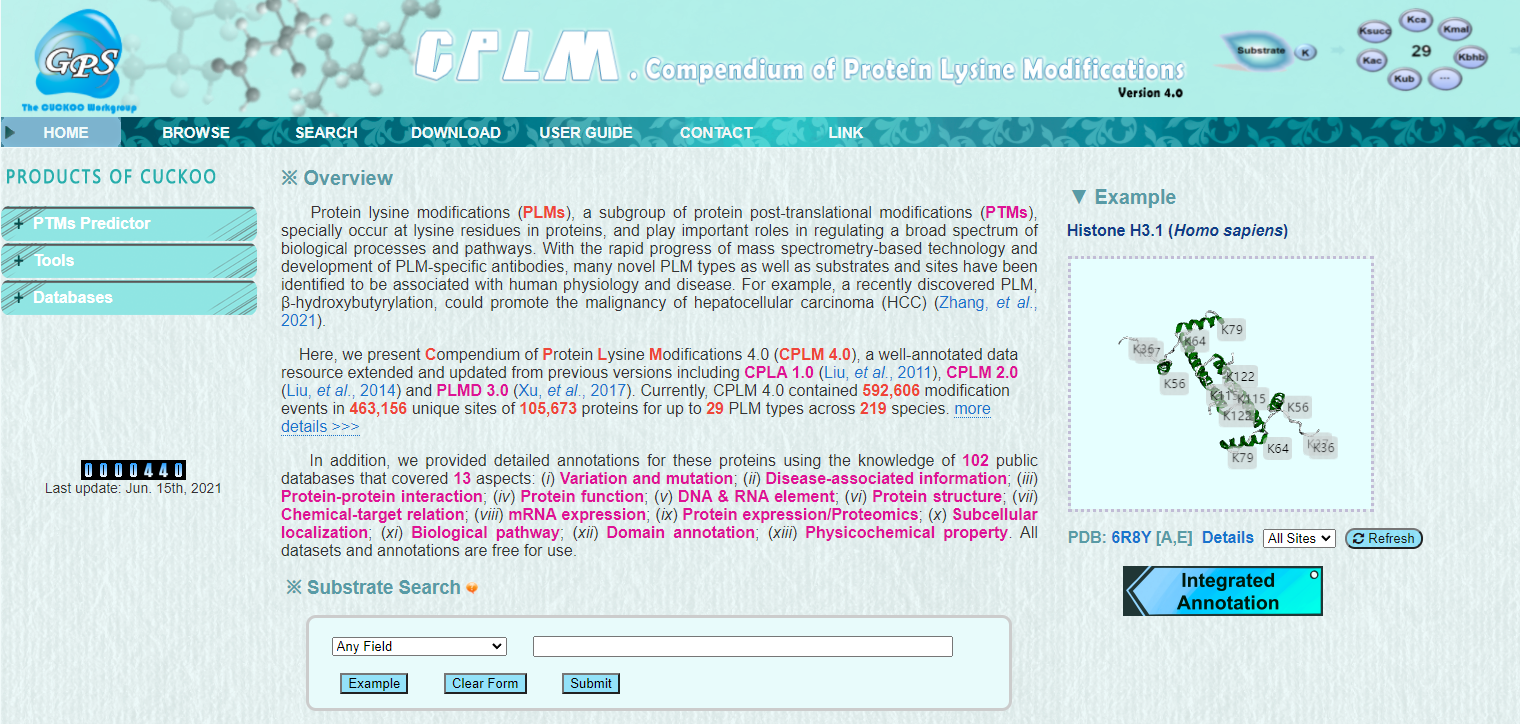 In this work, based on the previous version of PLMD 3.0, we expanded the lysine modification events from 284,780 to 592,606 by manual curation of the literature data and integrating 8 post-translational modification databases. At the same time, we newly collected 9 lysine modification types. So far, CPLM 4.0 integrates 592,606 lysine modification events of 29 lysine modification types within 219 species. We also integrated 105 public databases to make detailed annotations for lysine modification proteins, so as to provide researchers with higher dimensional and more comprehensive information and interpretation for these proteins.