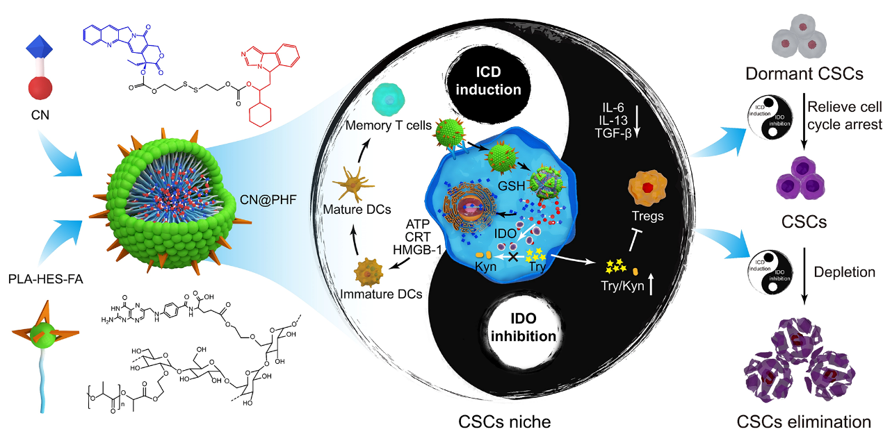 This study proposed a novel strategy to relieve CSCs dormancy and eliminate CSCs via remodeling CSCs niche by the combination of inducing immunogenic cell death and inhibiting indoleamine 2, 3-dioxygenase, which has important implications for anti-CSCs therapy. This study systematically evaluated the antitumor activity, toxicity and optimal dosage of prodrug molecule CN and its nano-preparation. The prodrug molecule CN and its nanoformulation showed great potential for bedside applications.