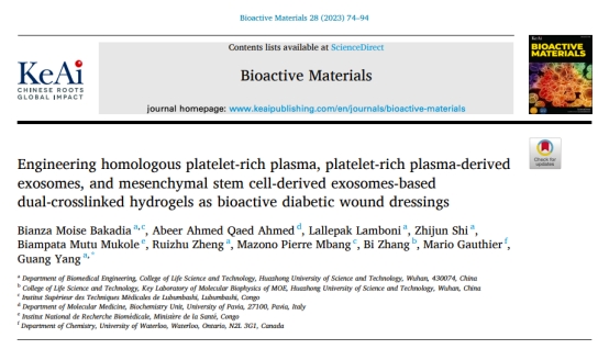 2023年5月17日,我校william威廉英国生物医学工程系杨光教授3-Bio团队在国际著名期刊《Bioactive Materials》上发表了题为“Engineering homologous platelet-rich plasma, platelet-rich plasma-derived exosomes, and mesenchymal stem cell-derived exosomes-based dual-crosslinked hydrogels as bioactive diabetic wound dressing”的文章。