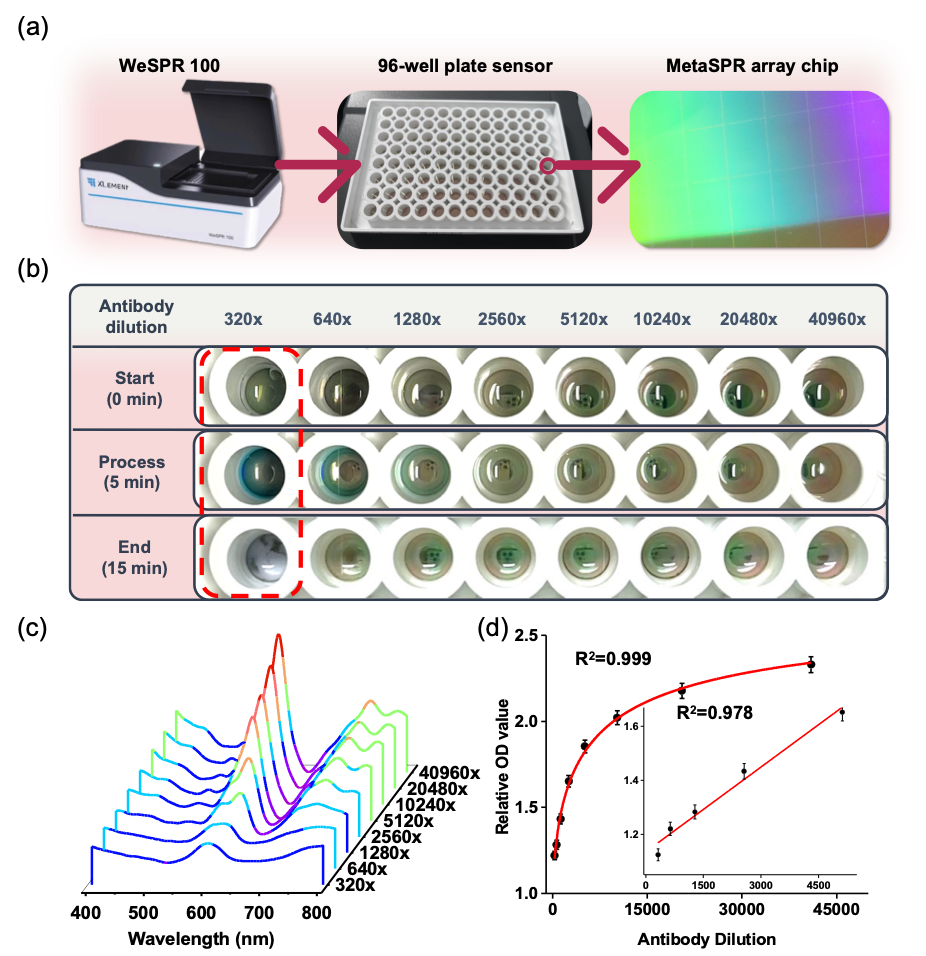 为了简化操作流程,研究者将MetaSPR光学芯片与高通量的96孔板集成,并使用多功能分子分析仪(XLement, WeSPR 100)进行光学信号检测。为了验证MetaSPR芯片的蚀刻效果,研究者将酶标抗体稀释不同浓度梯度后与MetaSPR芯片进行孵育,再加入显色试剂。结果证明芯片表面的蚀刻效果与酶标抗体浓度正相关。