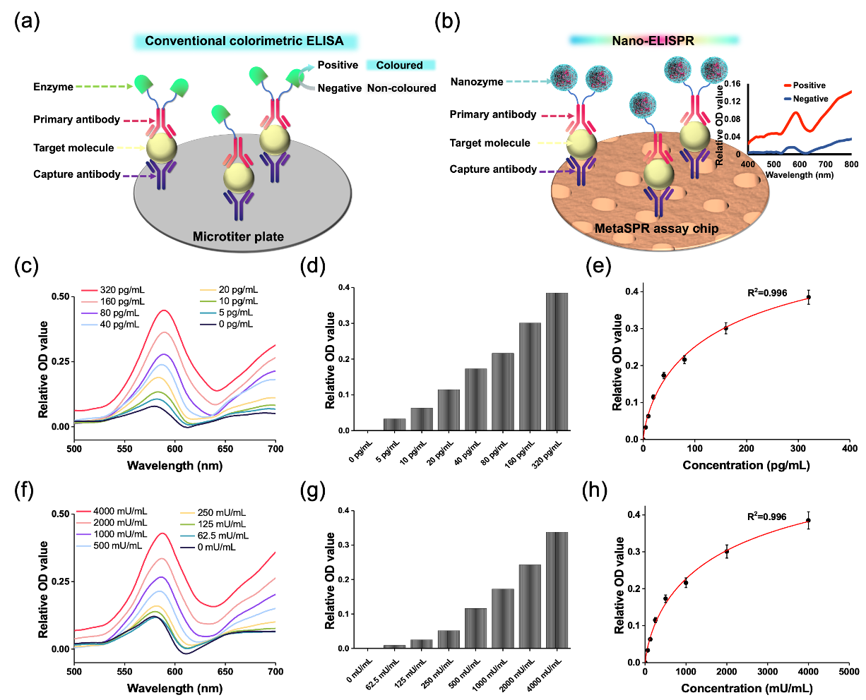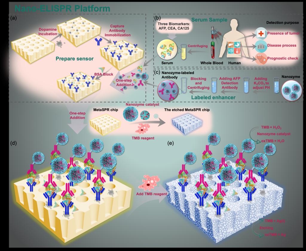 该研究利用一种低成本、便携的超表面等离子体生物传感器(MetaSPR)与人工纳米酶联用,构建了一种新型超表面等离子体刻蚀免疫传感器,即纳米酶联免疫吸附表面等离子体共振生物传感器(Nano-ELISPR),用于超灵敏和特异性进行早期筛查血清中的癌症生物标志物。