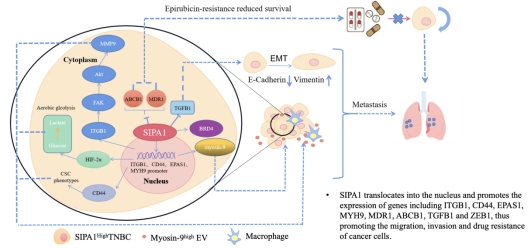 苏莉教授团队在揭示SIPA1蛋白调控癌症转移机制方面进行了长期研究。2015年在《Oncogene》上发表研究论文,揭示细胞核中SIPA1蛋白激活integrin β1转录,增强三阴乳腺癌细胞MDA-MB-231的侵袭能力(Zhang Y.)。后续研究进一步证明SIPA1调控HIF2a、MYH9等基因表达,改变肿瘤细胞糖代谢方式,募集巨噬细胞至肿瘤微环境,进而促进肿瘤细胞转移(Yao C, Front Cell Dev Biol. 2022;Feng L. Biology (Basel). 2022),上调乳腺癌细胞来源外泌体中LncRNA- LINC01615促进癌细胞迁移和侵袭(Xiang Y, Cancers (Basel), 2022);明确SIPA1通过调控CD44、MDR1和ABCB1的表达增强肿瘤化疗抵抗(Wang N, Stem Cell Res. 2020;Ma Y, Int J Biol Macromol. 2021), 发现SIPA1。并在分子水平上阐明SIPA1表达受DNA甲基化水平调控机制,发现Sipa1基因启动子近端元件CpG岛的低甲基化可以提高SIPA1在乳腺癌细胞中的表达,促进癌细胞EMT转化,增强肿瘤迁移能力(Lu A, J Cell Sci. 2020)。这些研究成果对揭示SIPA1调控癌细胞转移的生物学机制至关重要。
