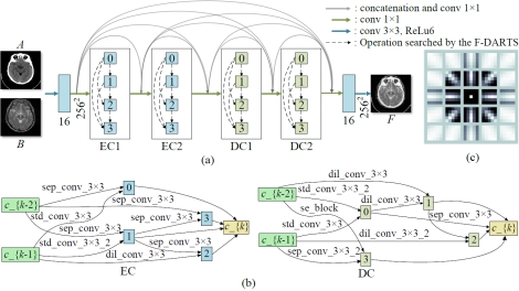 针对上述问题,研究团队提出了基于凹式可微分架构搜索(Foveated Differentiable Architecture Search,F-DARTS)的无监督MMIF方法。该方法首次将人眼视觉特性引入网络权重学习过程中,结合基于互信息、结构相似性和边缘保护值的无监督损失函数,最终借助F-DARTS自动搜索最优编码-解码网络构架,由此实现多模医学图像的有效融合。在MR,CT和SPECT等影像数据上的实验结果表明:与传统融合方法及基于深度学习的融合方法相比,基于F-DARTS的融合方法不仅在互信息、边缘保护、伪影、视觉感知等十项客观指标上具有明显优势,而且可有效融合源图像的细节信息,融合结果对比度高,伪影少,在病变监测、临床诊断及手术导航等领域具有广阔的应用前景。目前,该方法已在团队研发的基于多模信息融合的手术导航设备中得到应用。