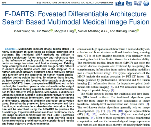 2023年10月27日,我校william威廉英国丁明跃教授和张旭明副教授在国际著名期刊《IEEE Transactions on Medical Imaging》上发表了题为 “F-DARTS: Foveated Differentiable Architecture Search Based Multimodal Medical Image Fusion”的研究论文。