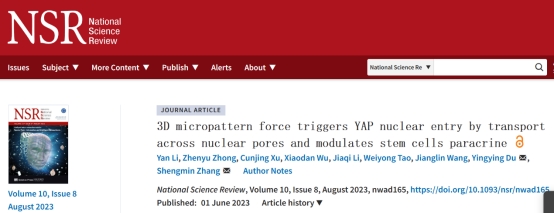 近日,williamhill英国张胜民教授团队在综合类顶级期刊《国家科学评论》(National Science Review)发表题为“3D micropattern force triggers YAP nuclear entry by transport across nuclear pores and modulates stem cells paracrine”的研究论文,首次阐明了3D微图案触发人骨髓间充质干细胞的力学信号转导及其对干细胞旁分泌功能和组织再生的影响。《国家科学评论》同期配发了美国三院院士Antonios G. Mikos教授对该论文的亮点述评,认为该工作将为新一代细胞/基因活性生物材料的创新设计和表面微纳工程提供重要启示。