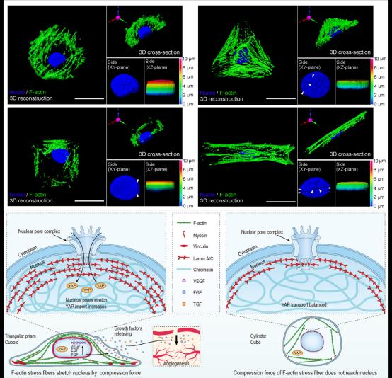 张胜民教授团队利用光刻微制造技术制备了具有不同3D几何形状的水凝胶微图案阵列,单细胞入孔率达75%以上。该研究提出了3D微图案力(3D Micropattern Force)的概念,并阐明了3D微图案调控人骨髓间充质干细胞力学信号转导的机制:3D微图案力通过调控细胞骨架空间重组,引起核孔拉伸变形,触发YAP入核,进一步通过力学信号转导途径调控干细胞旁分泌,从而促进血管化组织再生。实验证实,三棱柱和长方体微图案调控细胞中F-actin纤维的取向性增加并有序分布在细胞核上。细胞核受到压缩力,导致核孔被拉伸,降低了核孔对YAP入核的物理性屏障限制,从而促进YAP细胞核转运。上述微图案调控的力学信号转导显著增强了细胞的旁分泌功能,血管内皮生长因子、成纤维细胞生长因子和转化生长因子等基因表达和蛋白分泌水平上调,进而促进了体内血管生成和缺损部位皮肤组织再生。