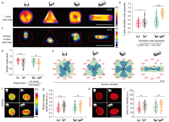 图3. 3D微图案调控MSCs细胞核重塑和机械力