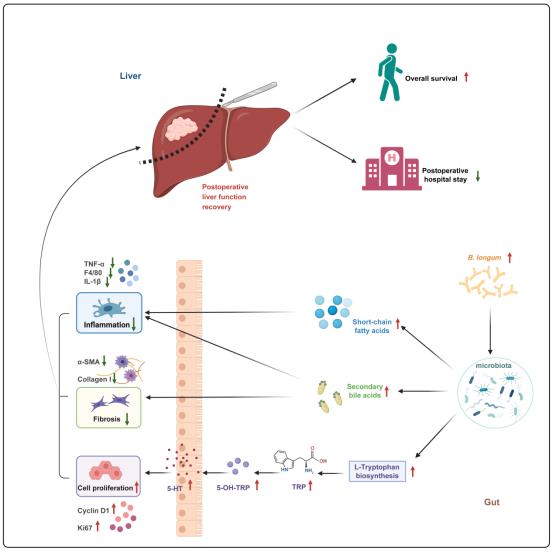 总之,该研究结果表明,活体微生物长双歧杆菌通过调节肠道微生物及其代谢产物可以增强HCC病人术后肝功能的恢复,从而改善病人的预后,为HCC病人提供了一种有前景的治疗策略。