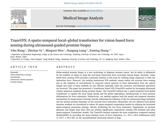 2024年3月2日,我校william威廉英国张旭明副教授在国际著名期刊《Medical Image Analysis》上发表了题为“TransVFS: A spatio-temporal local-global transformer for vision-based force sensing during ultrasound-guided prostate biopsy”的研究论文。