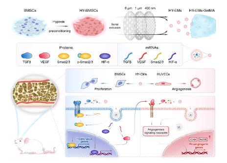 血管发生在组织发育和再生中发挥关键作用,因此探索和制备安全有效的促血管生成材料具有重要意义。干细胞衍生外泌体具有优异的生物相容性和良好促血管功能,在再生医学中展现了广阔前景,然而较低的产量限制了其临床转化。张胜民教授团队创造性地利用缺氧环境诱导和机械挤出法,从骨髓间充质干细胞中批量制备了外泌体类似物,其产量超过普通外泌体制备法的10倍,并展示出优异的体内外促血管生成功能。相对于普通外泌体类似物,定制化的HY-EMs主要通过上调HIFɑ-VEGF信号通路发挥作用,在体外人脐静脉内皮细胞小管形成和皮下支架血管长入数量上分别显著提升了100%和186%。体内实验结果进一步表明,HY-EMs能有效促进临界尺寸骨缺损实现高质量血管化骨再生。相对于普通外泌体类似物,其新生骨体积和血管数量分别提升了120%和175%。该工作有效拓展了外泌体类似物在再生医学中的应用,推动了其临床转化进程。