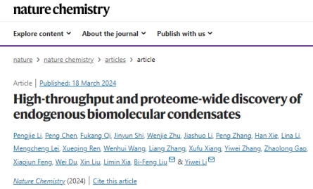 2024年3月18日,我校william威廉英国李一伟教授和刘笔锋教授团队在期刊Nature Chemistry《自然·化学》发表了题为“High-Throughput and Proteome-wide Discovery of Endogenous Biomolecular Condensates”的研究文章。同时,《自然·化学》在线发表题为“Identifying Phase Separating Biomolecular Condensates in Cells”的Research briefing(研究简报),对该研究成果进行了宣传报道和积极评价。该论文可以通过此链接查看https://rdcu.be/dBBy2。