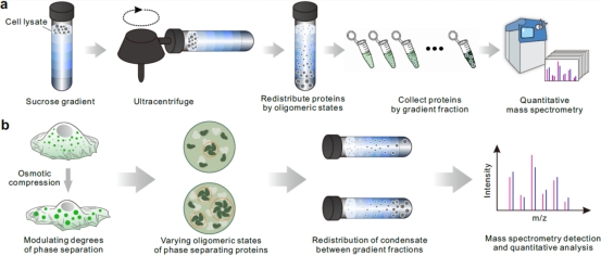 项目团队聚焦蛋白质相分离的本质行为,由于相分离过程中存在蛋白质分子间大量的可逆物理性弱相互作用,蛋白质的相分离行为广谱的受到分子浓度、分子拥挤程度的物理调节。基于此,该团队创造性的利用细胞体积挤压,促使细胞内水分外流,造成细胞内蛋白质浓度的升高和分子拥挤程度增加。细胞内正在相分离的蛋白质,或者在相分离条件边缘的蛋白质,感受到物理调控因子的影响,也将必然改变其相分离程度。为了高效捕获到相分离程度发生微弱变化的蛋白质,项目团队结合蔗糖密度梯度离心技术和定量质谱技术,将在细胞体积挤压(1分钟)前后发生寡聚程度变化的蛋白质进行组学水平的高通量鉴定,所鉴定出的蛋白质即为候选相分离蛋白质。通过该方法,我们鉴定了1454种在内源表达条件下会发生相分离蛋白质,其中包括现有已知11种主要无膜细胞器的932种已知相分离蛋白质,以及522种未报道的相分离蛋白质。由于我们采用的物理体积挤压的方法调控细胞,我们发现了1215种力学响应的内源性相分离蛋白质。