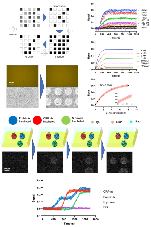 项目团队采用纳米光刻法和电子束蒸发法制造的低成本的超表面等离子共振技术(MetaSPR)并结合模具形成的聚二甲基硅氧烷(PDMS)微流体浓度梯度发生器装置(CGGD)或三维打印塑料微流体空白装置进行结合和解离检测。通过基于同轴光学和普通 LED 白光照明的明场反射成像系统,并应用新开发的 Meta-SPR 芯片色度分析算法,通过微滴定点实现了高灵敏度的分子相互作用检测、多样品检测和背景噪声去除。结果表明,基于简单明场成像的MetaSPR亲和力检测平台可以在100 pM - 100 nM的浓度区间内实现实时的高通量分析生物分子互作检测。该团队运用微流控梯度发生器实现了自动样品浓度稀释,大大简化了实验流程。该工作使用微纳液滴点样技术和形态学启发的图像处理技术,在同一个视野下实现了原位的非特异性信号去除并实现复杂多样本同时检测。该研究成果表明基于成像的MetaSPR生物分子检测技术具备较大的发展潜力。