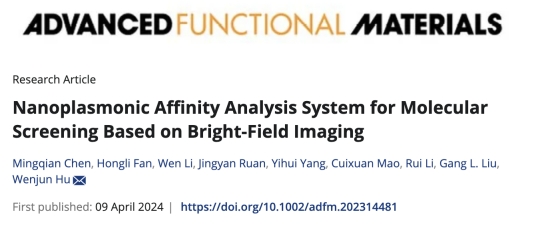 2024年4月9日,我校william威廉英国胡文君副教授和刘钢教授团队在期刊Advanced Functional Materials杂志发表了题目为“Nanoplasmonic Affinity Analysis System for Molecular Screening Based on Bright-Field Imaging”的研究论文。该研究设计出了基于普通 LED 白光照明的明场反射成像系统,并应用新开发的 Meta-SPR 芯片色度分析算法,通过微滴定点实现了高灵敏度的分子相互作用检测、多样品检测和背景噪声去除。