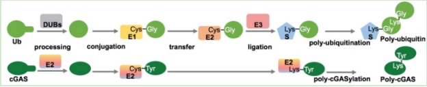 近期发现的新型原核生物免疫系统中与真核生物免疫系统最相关的当属CBASS (基于环寡核酸的抗噬菌体信号系统,cyclic oligonucleotide based anti‑phage signaling systems),由于直接相关于哺乳动物先天免疫cGAS‑STING通路的起源,CBASS受到高度关注。在当前对CBASS系统中的信号合成元件和信号接收元件的研究热潮中,朱斌团队独辟蹊径关注到一类CBASS附属调控元件并首次对其功能和调控机制开展研究。在已知基因组的细菌中根据序列同源性预测有超过10%(>6000种)含有CBASS,其中超过600种CBASS除了编码一个典型的环寡核酸合成酶cGAS和一个受环寡核酸信号分子激活的效应蛋白质之外还编码一个与真核生物泛素结合酶E2同源的未知功能蛋白质。通过生化、分子、细胞、遗传和结构研究手段,朱斌团队及合作者展示了一个单独原核生物E2酶模拟真核生物至少五个蛋白质(E1、E2、E3、蛋白酶、蛋白质受体)才能完成的泛素化调控催化形成共价多聚poly-cGAS并激活其合成cGAMP免疫信号的新机制,为泛素系统的进化提供了线索。在蛋白质化学机制方面,与泛素化过程中普遍产生甘氨酸—赖氨酸异肽键不同,细菌E2在蛋白质连接过程中识别甘氨酸但连接时将其切除,与分选酶(Sortase)连接机制接近。本研究报道了一种新的蛋白质修饰化学机制并发现已知唯一具有蛋白酶活性的E2结合酶。